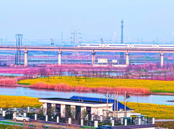 3月9日下午,一列“开往春天”的列车正行驶在合肥十八联圩的油菜花田间。金黄的油菜花像铺开的绒毯,把整个春天都装在了飞奔的列车上。通讯员 李中蒙 摄 (安徽图片网供图)