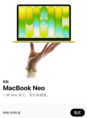 MacBook Neo作为苹果史上最亲民笔记本,官方定价是4599元。虽然官方定价搭配上残血A18 Pro等配置,整体看起来性价比不高,但叠加教育优惠和国补之后,真正的到手价只要3310元起,性价比暴涨。