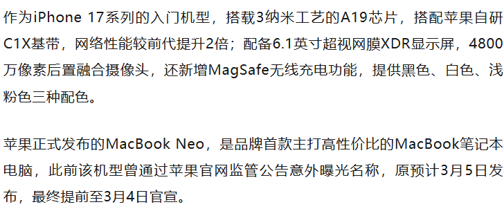 3月11日,iPhone 17e与MacBook Neo正式开售。