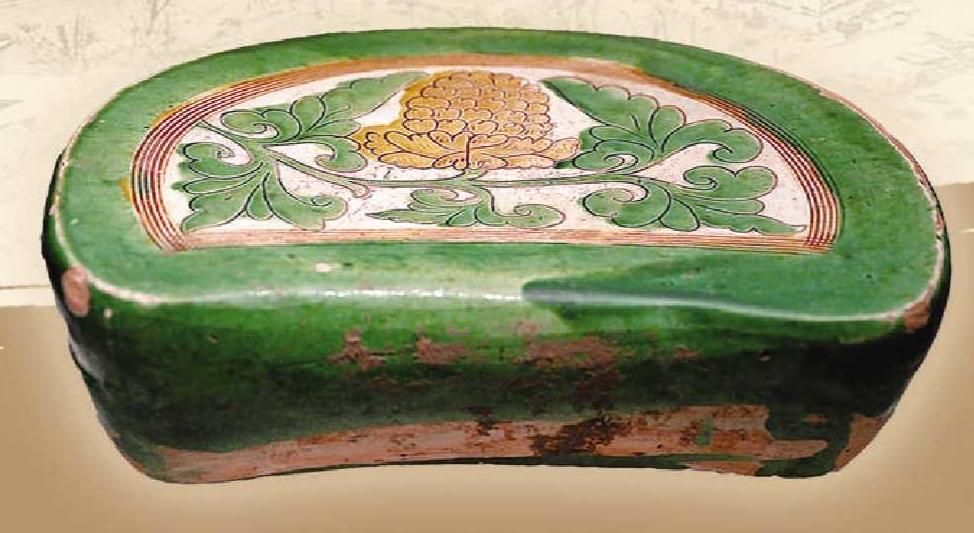 在淮北市博物馆,展示的宋三彩刻花牡丹纹腰圆形枕。