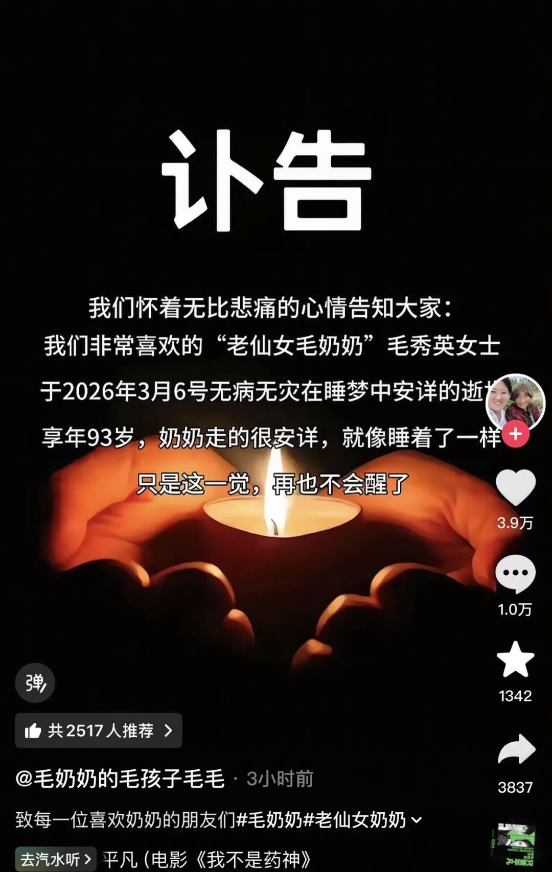 3月12日,抖音账号@毛奶奶的毛孩子毛毛 发布讣告,称“老仙女毛奶奶”毛秀英于2026年3月6日在睡梦中安详去世,享年93岁。
