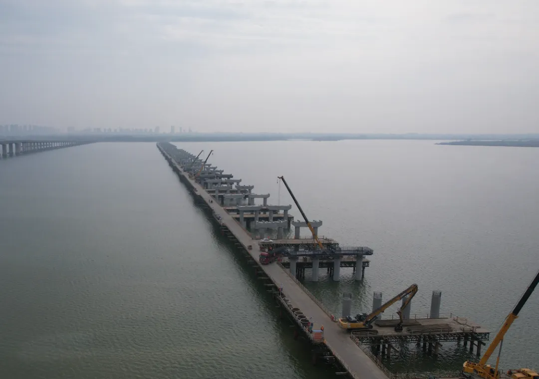 在霍邱县城东湖跨湖大桥施工一线,装机助力、墩柱成排。城东湖特大桥是S20长丰至固始高速公路霍邱至皖豫界段的关键控制性工程,是安徽省首个采用高速与国道共线的双层桥,上层为S20长固高速,下层为G328国道,桥梁总长5.66公里,横跨3.6公里水域。记者了解到,当前,该项目路基工程已完成48%,累计填筑土石方超870万方;桥梁工程完成53%,桩基、墩柱分别完成4140根和2654根,预制箱梁达1893片。全线控制性工程——城东湖双层桥已进入下部结构和预制梁架设施工阶段;城西湖大桥水中桩基全部完成,现全力冲刺下部结构收官,项目建设正全速推进,为“十五五”交通建设开好局、起好步贡献一线力量。