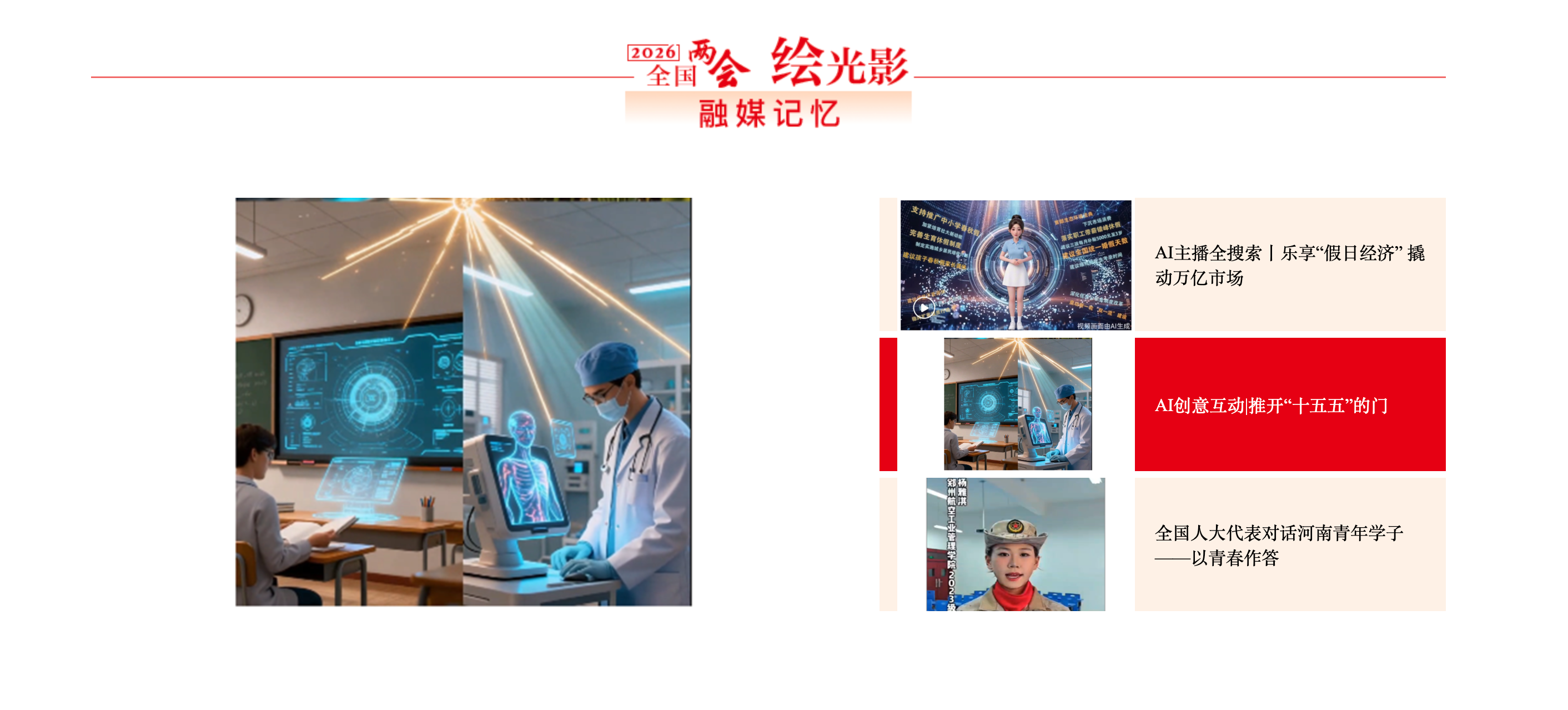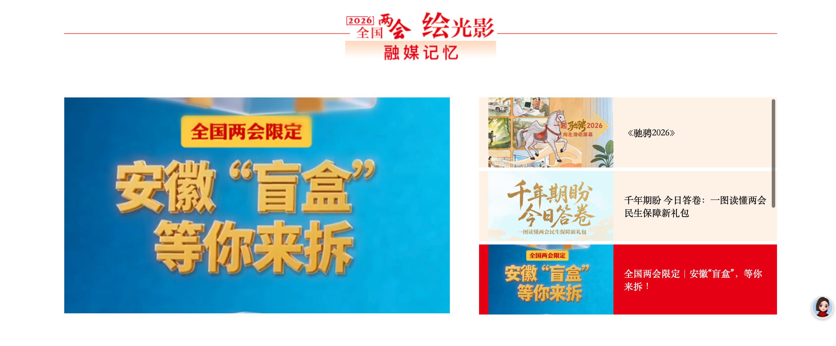 技术赋能新闻生产,AIGC与互动创意贯穿内容创作全链条。《全国两会限定|安徽“盲盒”,等你来拆!》将EAST“亿度千秒”、新能源汽车等8个维度硬核成就化为惊喜盲盒,最终拼合成发光的“皖”字,实现省域形象创意表达,获中国记协网全国两会专题首页推荐。《AI创意互动|推开“十五五”的门》以“门”为核心意象,将抽象规划转化为可触摸的交互体验,登上中国记协网2026全国两会专题首页。