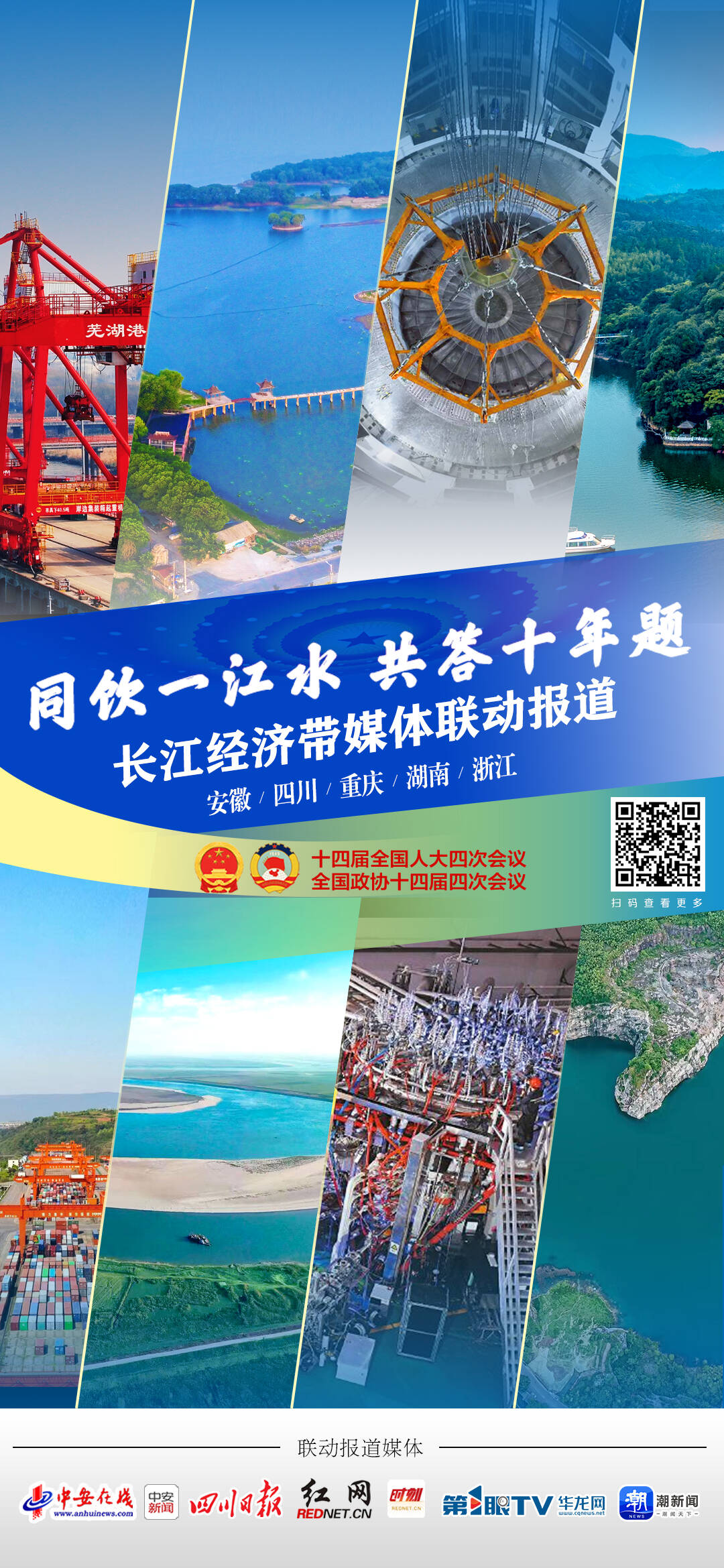 十年牢记嘱托,一江共答考卷。2016年,习近平总书记在重庆主持召开推动长江经济带发展座谈会,为这条母亲河擘画“生态优先、绿色发展”的宏伟蓝图。十年后的全国两会期间,安徽新媒体集团联动川渝湘浙四省市主流媒体,循江而下、深入蹲点,以融媒体系列深度调研报道《长江经济带媒体联动报道·同饮一江水 共答十年题》致敬这一重大战略节点。报道以“双城对话”的创新视角,让合肥与成都隔空碰撞“逐日”之光,探寻科技自立自强的江淮—巴蜀回响;让芜湖港与重庆港共话“黄金水道”的万里奔赴,记录港口群联动协作的生动实践;让巢湖与洞庭湖互探生态修复的“绿色密码”,呈现流域治理的系统之变;让广德与安吉携手演绎小城“出圈”的精彩蝶变,解码文旅融合的县域样本。四组“城市CP”以小切口映照大时代,用海报定格发展脉动,以深度观察解析协同逻辑,既有国家战略的宏阔叙事,又有一线调研的泥土芬芳,创新跨省联动与融合报道新范式。联动传播成效显著,为长江经济带高质量发展写下践行嘱托的生动注脚。