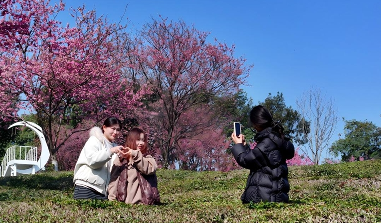 3月12日,徽州区谢裕大茶博园内,游客在缤纷的樱花茶园拍照打卡。春日时节,谢裕大茶博园新茶吐绿,樱花绽放,红绿相间,美不胜收。樊成柱/摄
