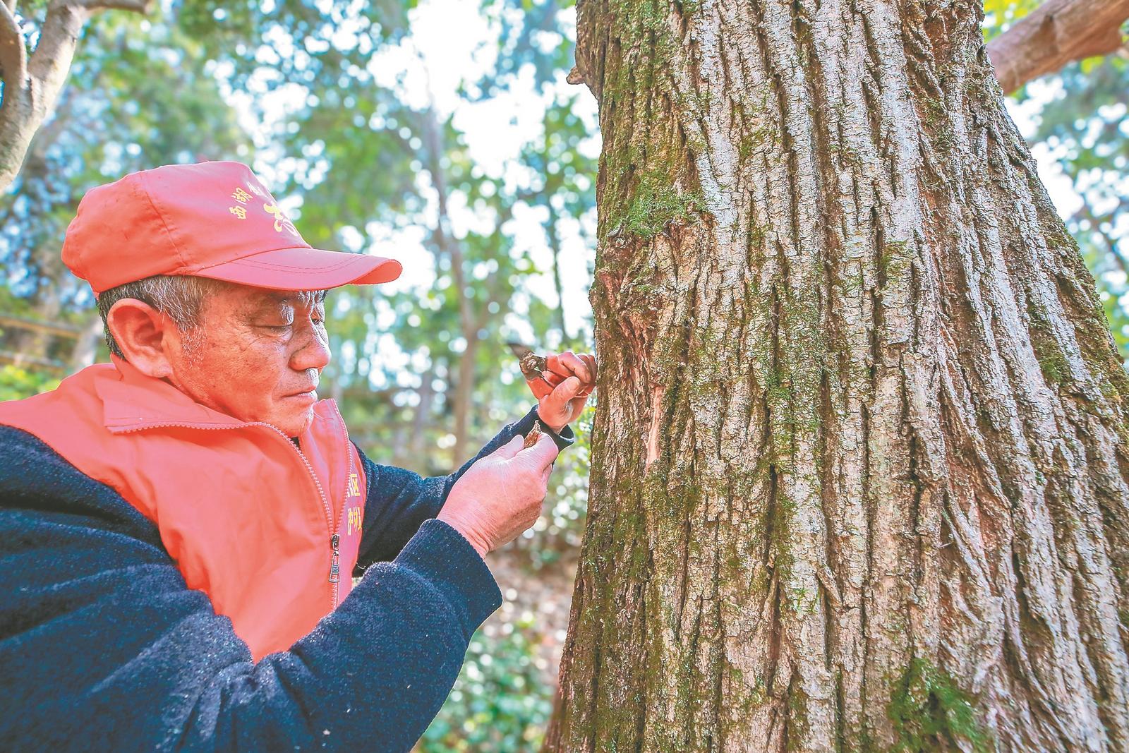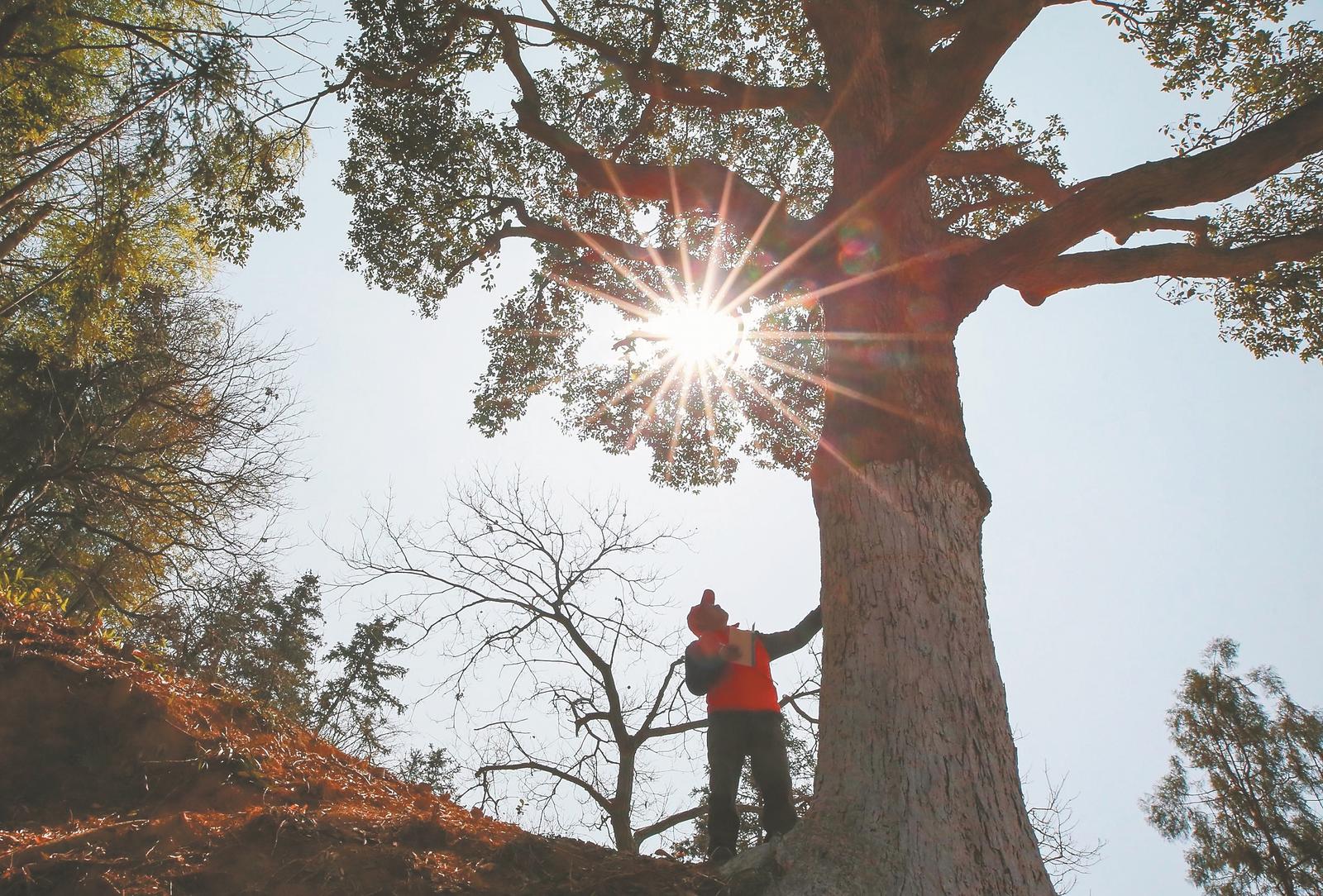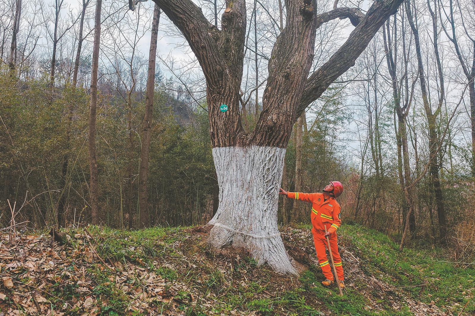 3月13日,生态护林员陈显忠在查看春季古树生长情况。