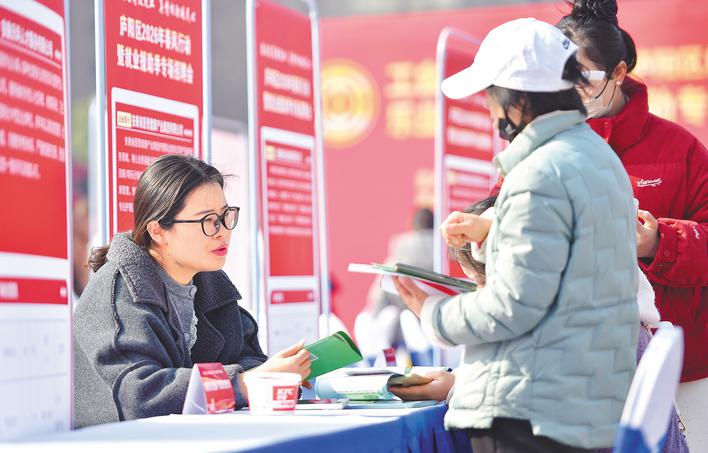 3月13日,在合肥市四里河路与北二环路交口明发商业广场,市民在寻找适合的工作岗位。当日,庐阳区2026年春风行动暨就业援助季专场招聘会举行,50余家用工单位带来800多个岗位,让市民在家门口就能找到好的工作岗位。