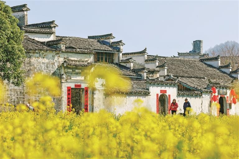 3月13日,安徽省黄山市黟县西递古村油菜花盛开。