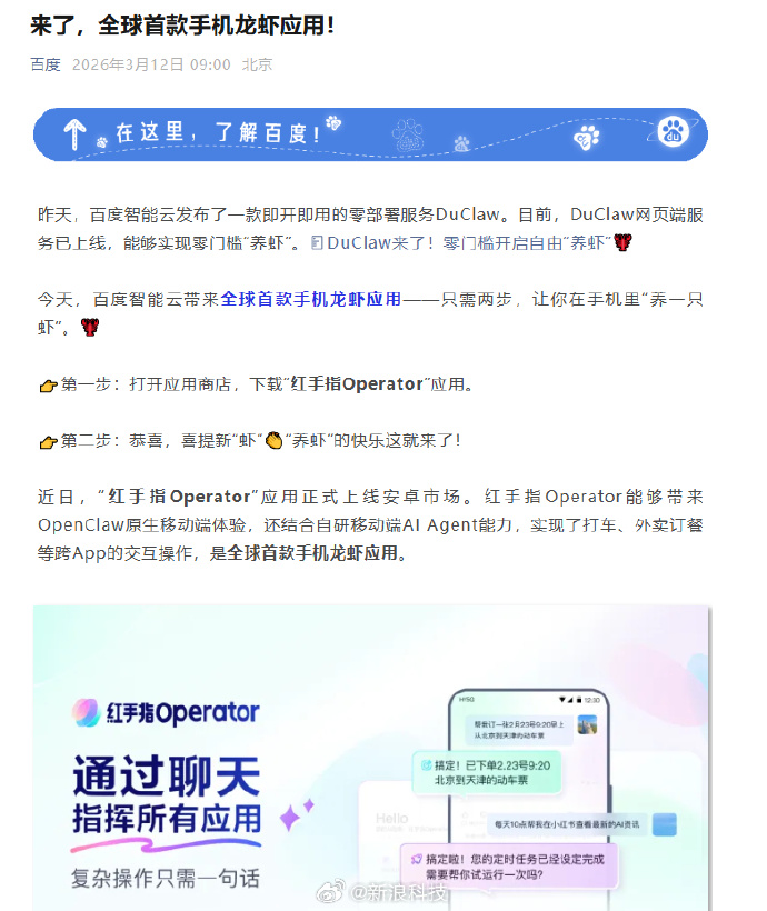 百度智能云带来全球首款手机龙虾应用——只需两步,让你在手机里“养一只虾”。