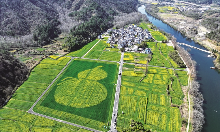3月14日,休宁县齐云山镇南坑村油菜花竞相绽放,与粉墙黛瓦的徽派民居交相辉映,吸引众多游客前来打卡,共赴一场春日之约。樊成柱/摄
