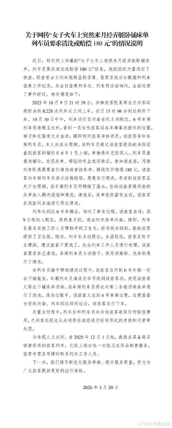 3月20日,“@兰州客运段”发布《关于网传“女子火车上突然来月经弄脏卧铺床单列车员要求清洗或赔偿180元”的情况说明》。