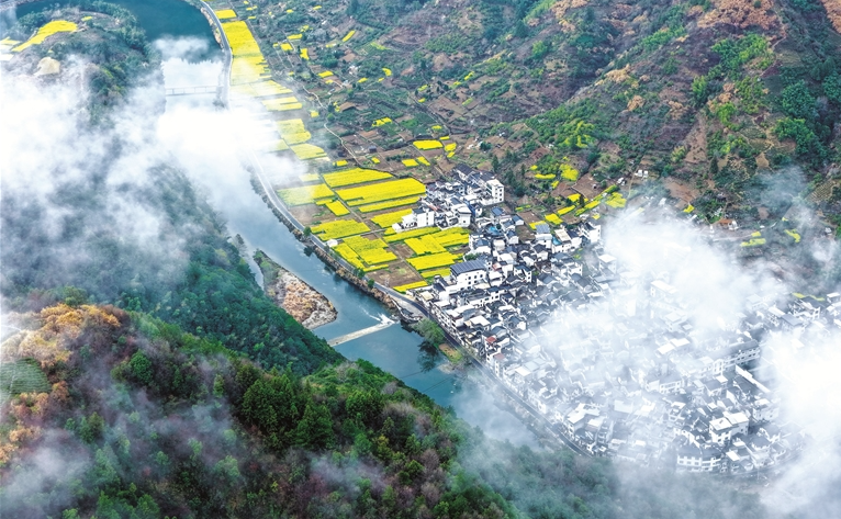 当日,春雨初歇的坡山村云雾升腾。漫山遍野的油菜花点缀在山峦之间,与若隐若现的徽派民居、远山交相辉映。坡山村以“村在云雾中,云雾在村中”闻名,春日里花海与云海同框,宛若一幅流动的山水画卷,令人沉醉在这云端之上的诗意春光里。施亚磊李飞/摄