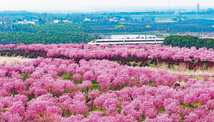 3月20日,肥东县长临河镇合福高铁沿线樱花竞相绽放,疾驰的列车穿行于姹紫嫣红的花海之间,与春日美景相映成趣,勾勒出一幅灵动鲜活、生机盎然的春日画卷。记者 郭如琦 通讯员 陈振 摄
