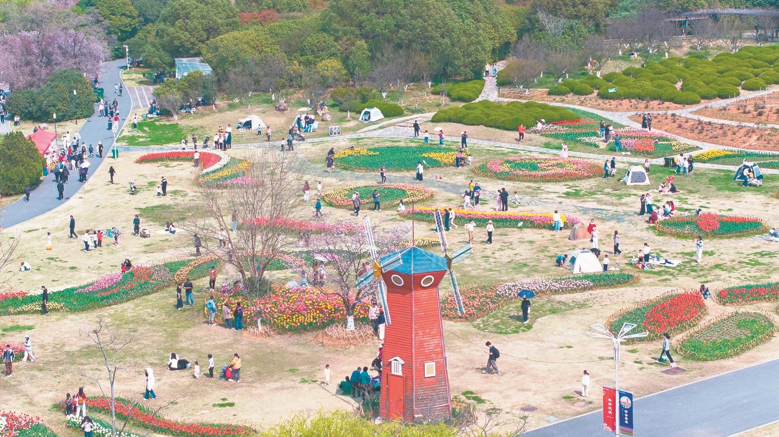 3月22日,合肥市植物园内郁金香竞相绽放,春意盎然,吸引众多游客前来踏青赏花。通讯员 赵明 摄