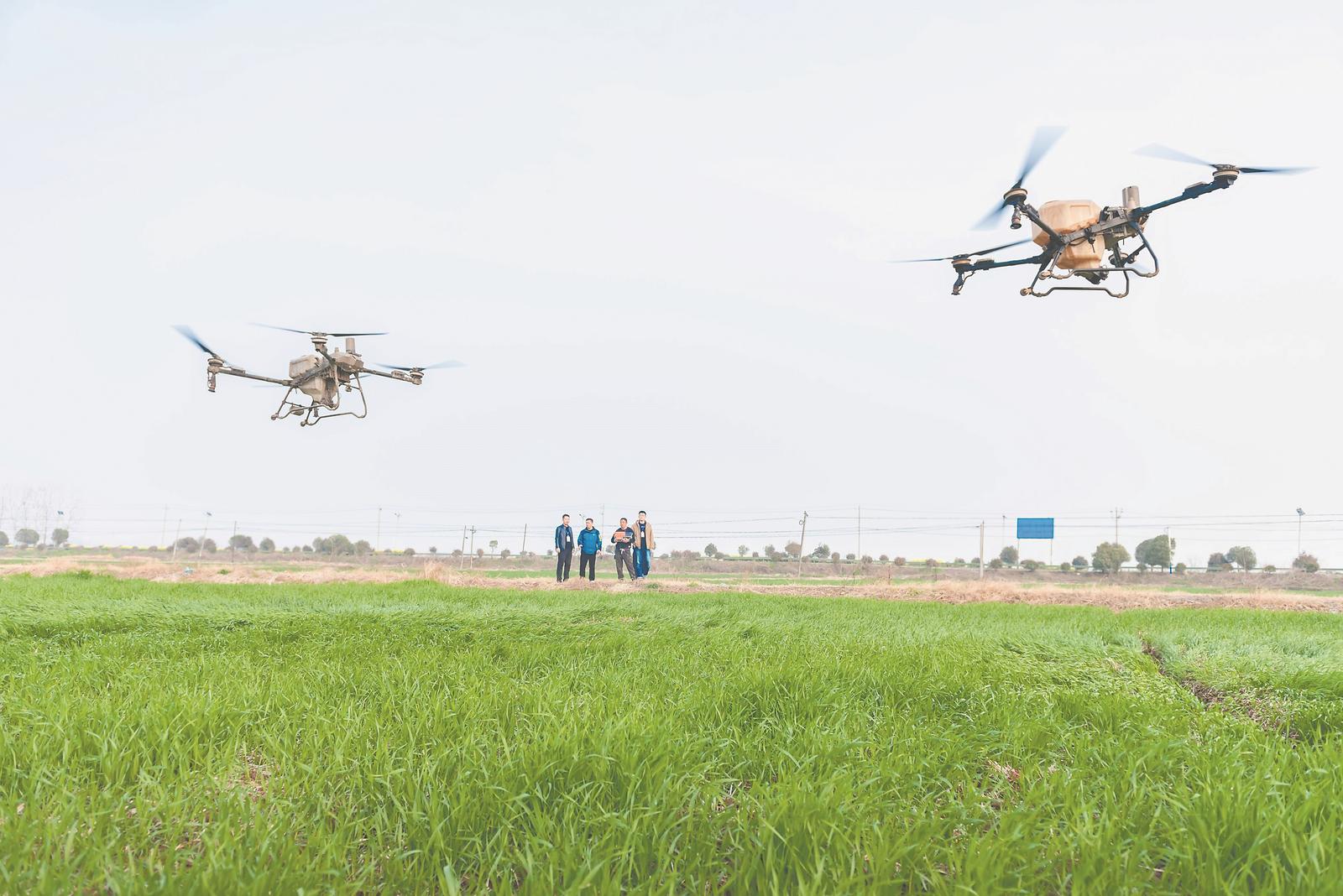 3月21日,在来安县大英镇耘泰农场,植保无人机在进行小麦飞防作业。近年来,来安县积极搭建智慧农技服务体系,以科技赋能田管,大幅提升植保作业效率。