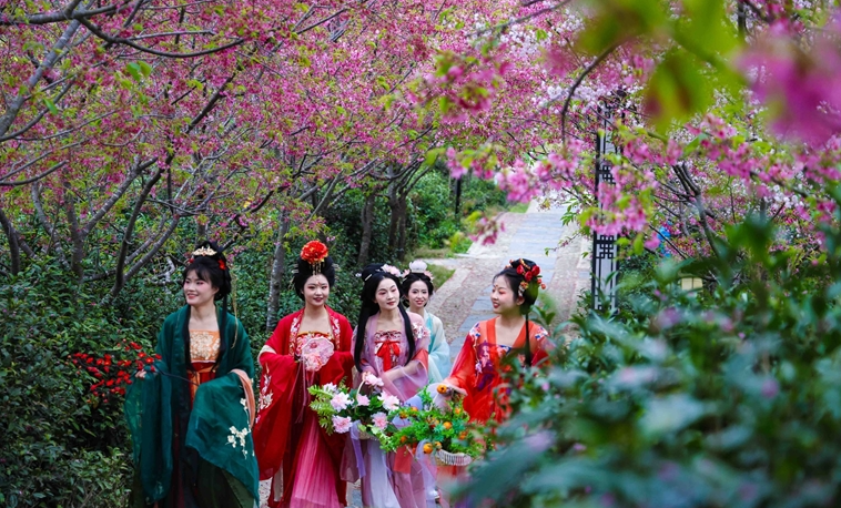 3月21日,祁门县平里镇樱花园内樱花进入盛花期,粉白相间、如云似霞,吸引了一批身着各式汉服的游客前来踏青赏花、打卡拍照。程启群/摄