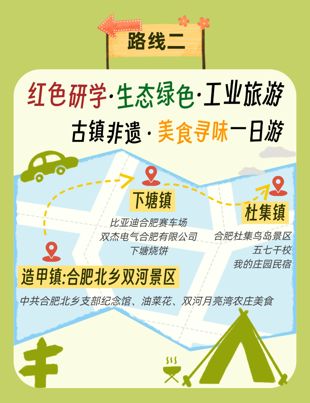 这是一条穿越历史与自然的深度之旅。清晨造访合肥北乡双河景区,在中共合肥北乡支部纪念馆里,红色记忆静静流淌;景区内,大片油菜花正迎风绽放,金黄铺天盖地,与青瓦白墙相映成趣。
