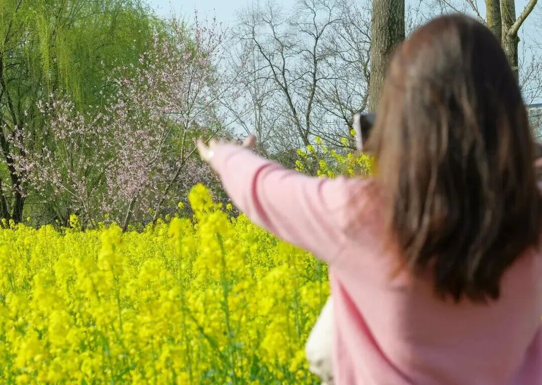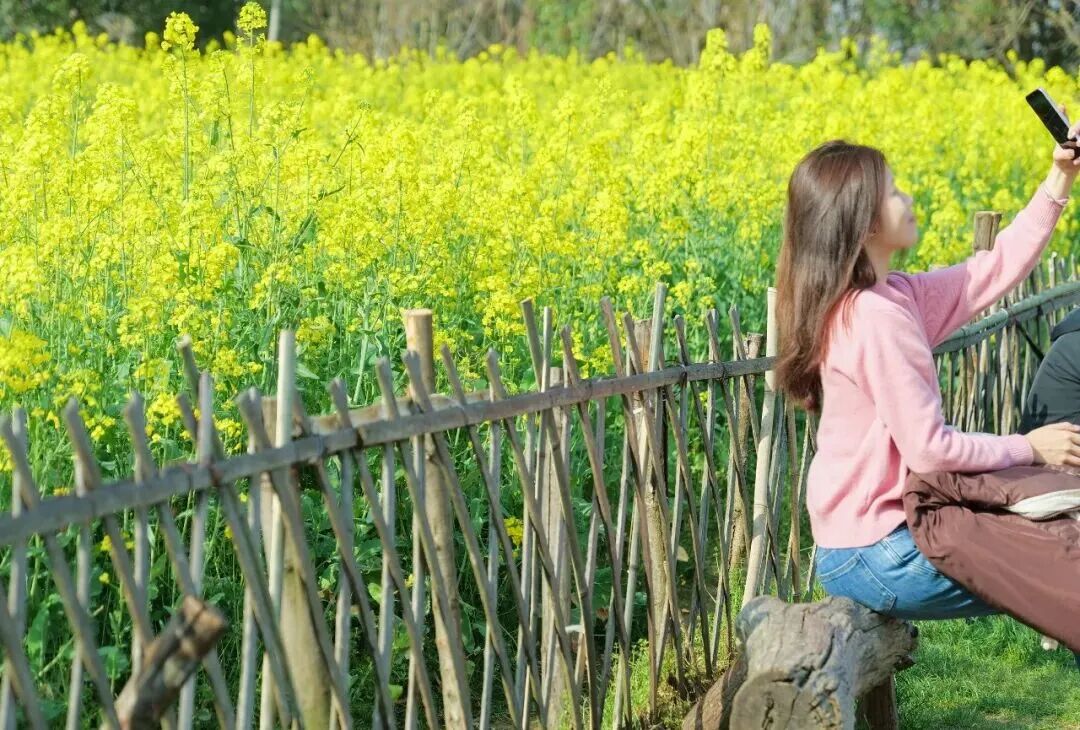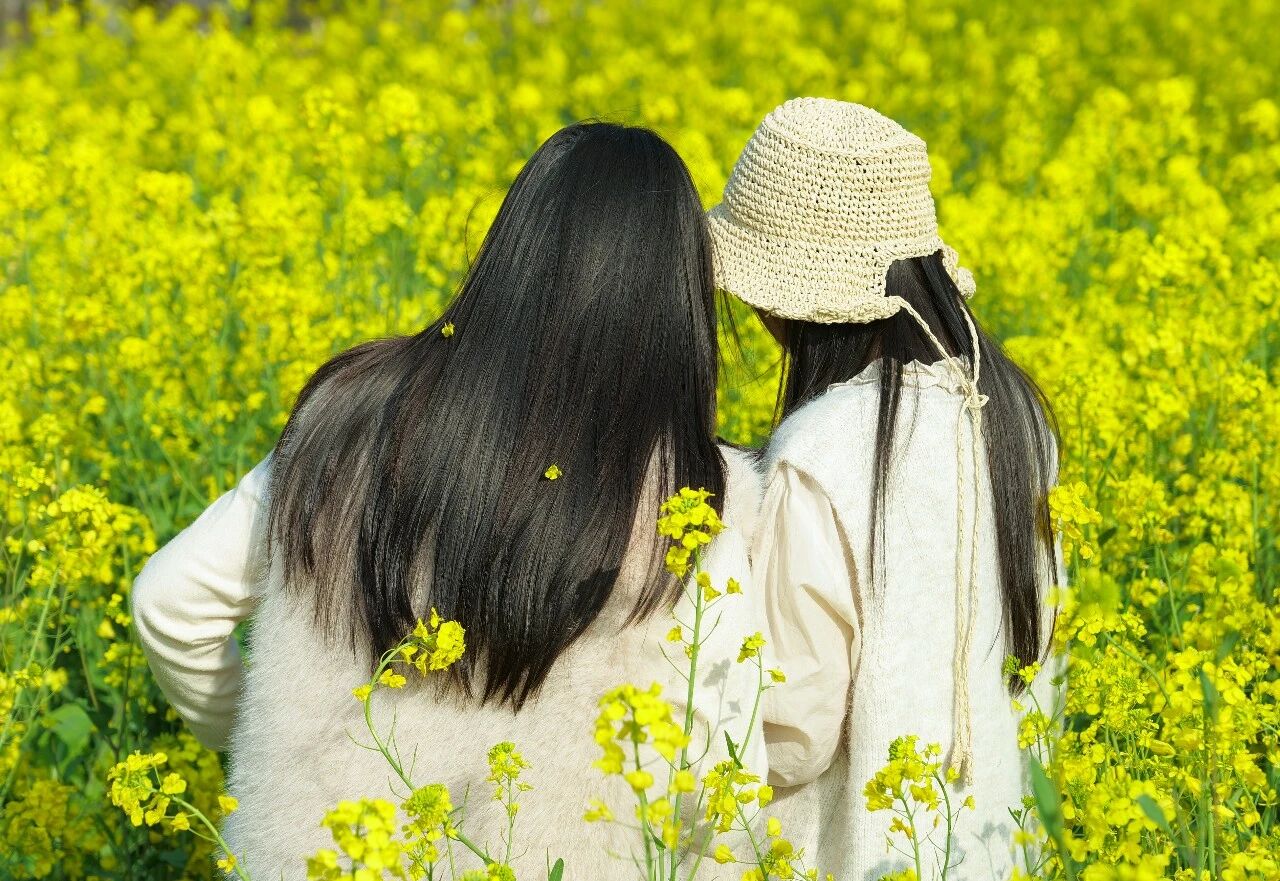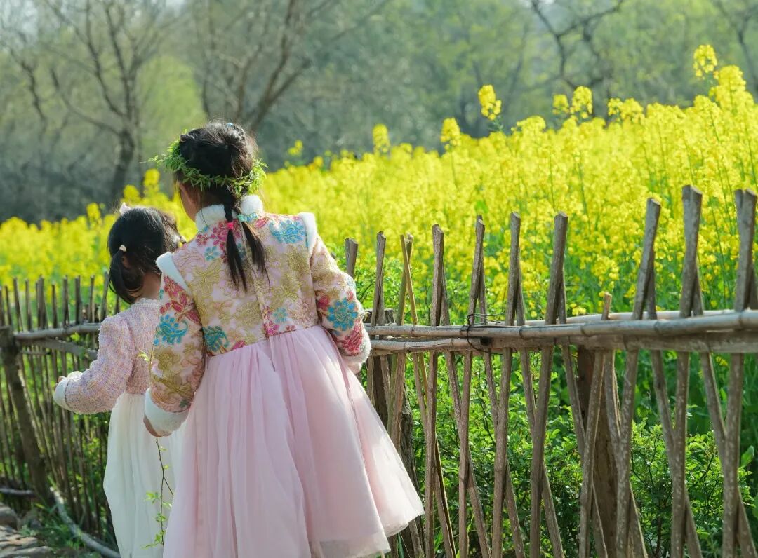 年轻的女孩们站在油菜花前,风一阵阵吹过,花浪起伏,也掀起她们轻盈的裙角与发丝。她们时不时走动,找寻新的拍摄角度,阳光给她们的脸庞镀上柔和的轮廓光,盛着春天和简单的快乐。