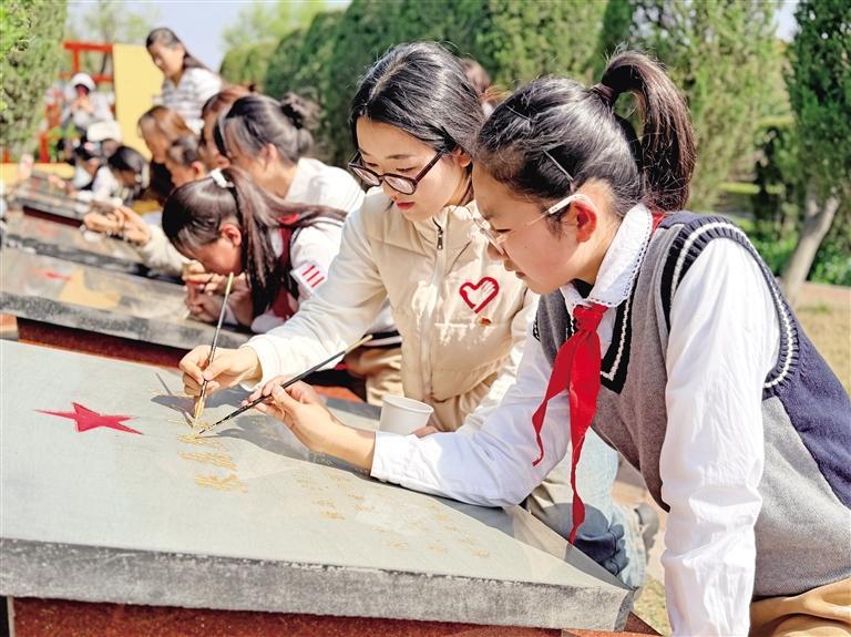 3月27日,安徽师范大学“红色青春守护人”志愿者团队30余名师生与芜湖市赭山小学、芜湖师范附小20名少先队员齐聚芜湖市烈士陵园,手持画笔,为烈士碑文“描金”。在清明节前夕,同学们通过为碑文描金的方式,缅怀先烈,致敬英雄。记者 汤荣汛 文/摄