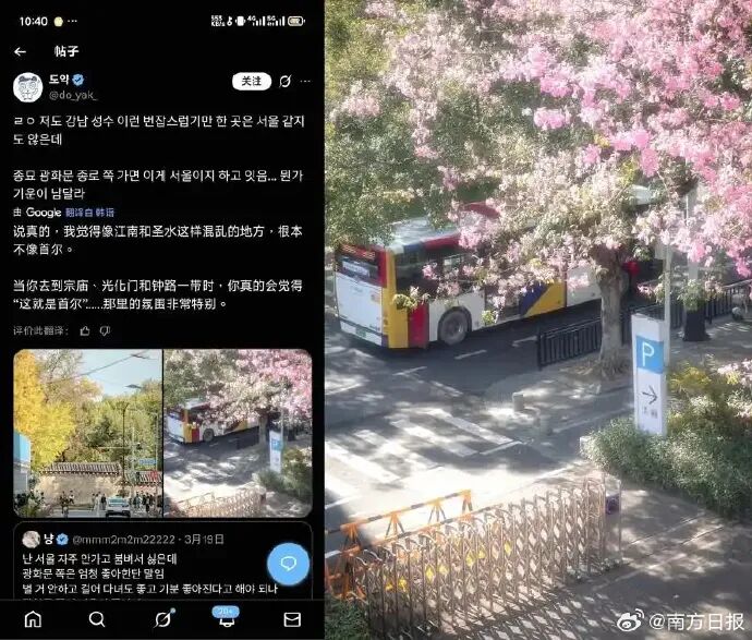 该博文显示,韩国博主的原帖共附有两张照片,名先生的作品为第二张。帖文的大意为,博主认为江南、圣水(洞)等地并不像首尔,而当人们走到宗庙、光化门和钟路一带时,才会觉得“这就是首尔”,并称赞那里的氛围很特别。