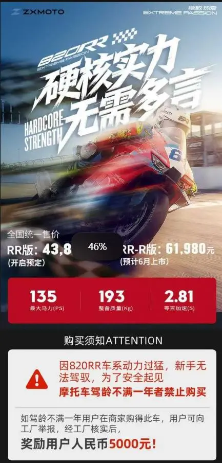 对于该售价,有资深摩友告诉极目新闻记者,与820RR同样大马力配置的机车售价至少超10万元,820RR的价格非常良心。另有公开信息显示,820RR开启预订后12个小时,累计锁单达1986台。