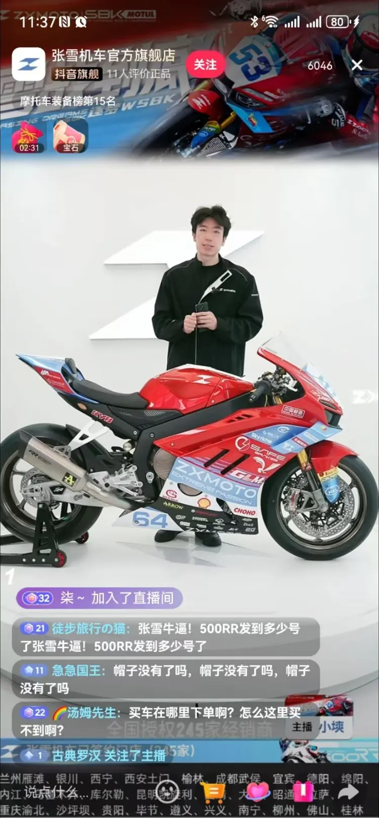 30日上午,在短视频平台,张雪机车各地门店直播间都有大量网友涌入,“张雪机车官方旗舰店”直播间涌进超6000人。网友都在关注价格、拉花、马力、试驾、周边产品等信息。对于门店售卖的车是否就是这次比赛赛道上的车,主播表示差别不大。据张雪曾经在自己的视频中讲述,上赛场的820RR在主要部件发动机、刹车盘、减震、卡钳、轮毂等跟量产版相同,只是在排气、水冷、仪表等按赛事要求进行改装。