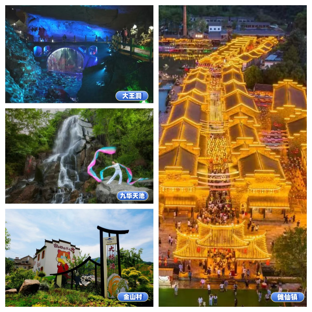 线路集山水奇趣、潮流体验、亲子欢乐与夜生活乐趣于一体。大王洞以“华东第一洞”的喀斯特地貌奇观,搭配洞外春日花海,让游客在自然秘境中感受春的灵动;九华天池的高山湖泊、峡谷溪流与烂漫山花相映成趣;夜幕下的傩仙镇,灯光秀、民俗表演与特色小吃街交织,打造热闹非凡的夜游盛宴。次日,马衙金山村的田园风光与亲子农场,为家庭游客提供了亲近自然、共享欢乐的温馨场景。