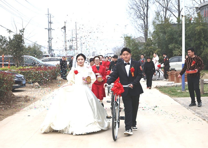 3月24日,在亳州市谯城区古井镇药王村,9对参加集体婚礼的新人,在亲朋好友的簇拥下,推着“二八大杠”自行车,步入婚礼现场。