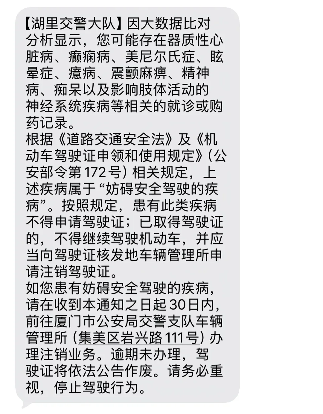 近日,一条通知注销驾驶证的短信备受关注,短信写道:(湖里交警大队)因大数据比对分析显示,您可能存在器质性心脏病、癫痫病、美尼尔氏症、眩晕症、癔病、震颤麻痹、精神病、痴呆以及影响肢体活动的神经系统疾病等相关的就诊或购药记录。根据《道路交通安全法》及《机动车驾驶证申领和使用规定》,上述疾病属于妨碍安全驾驶的疾病。按照规定,患有此类疾病不得申请驾驶证;已取得驾驶证的,不得继续驾驶机动车,并应当向驾驶证核发地车辆管理所申请注销驾驶证。如您患有妨碍安全驾驶的疾病,请在收到本通知之日起30日内,前往厦门市公安局交警支队车辆管理所办理注销业务。逾期未办理,驾驶证将依法公告作废。请务必重视,停止驾驶行为。