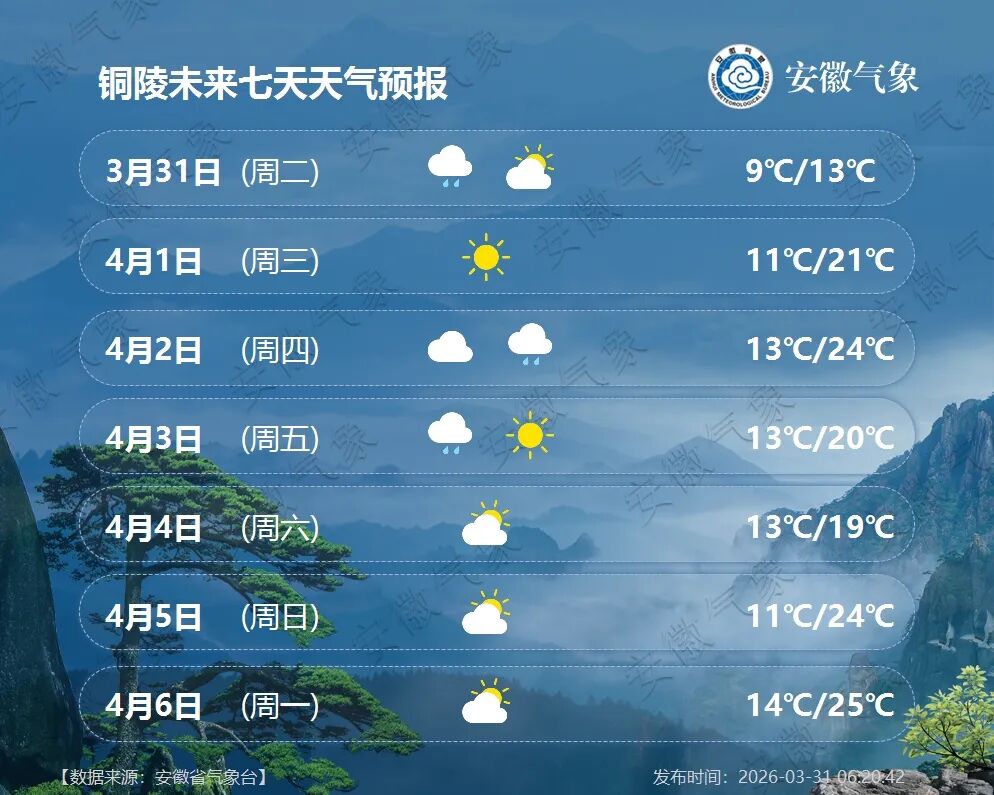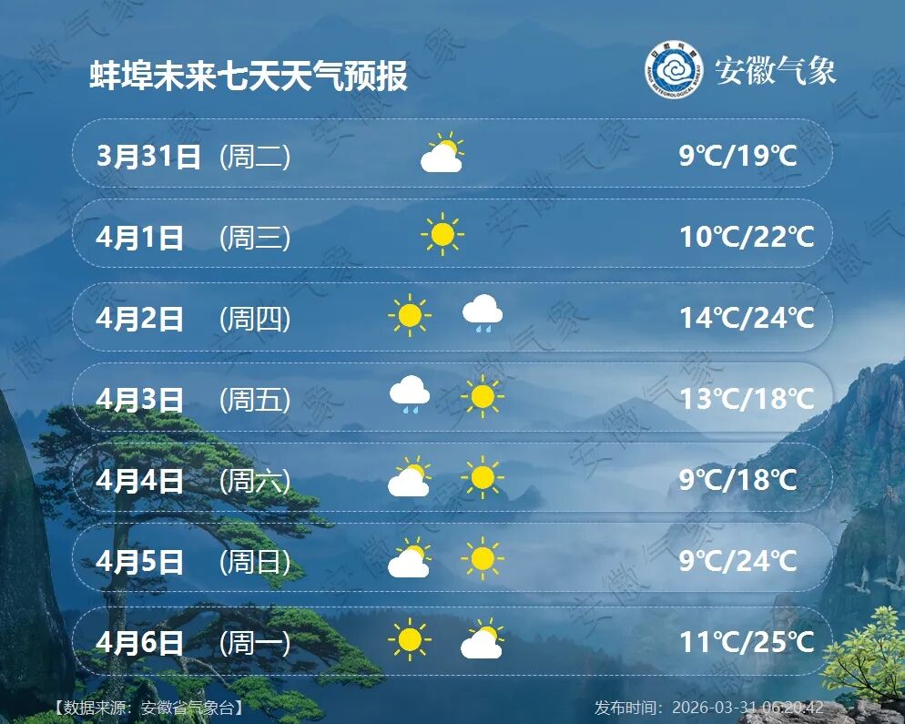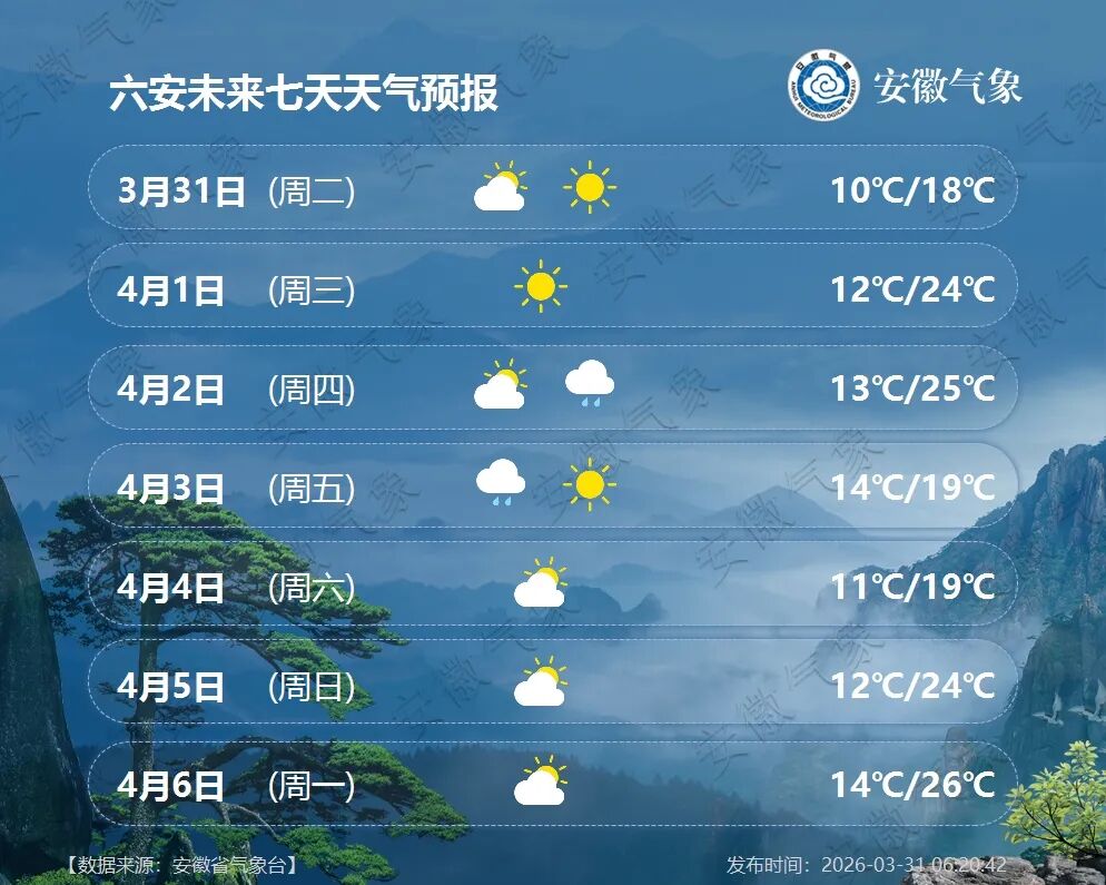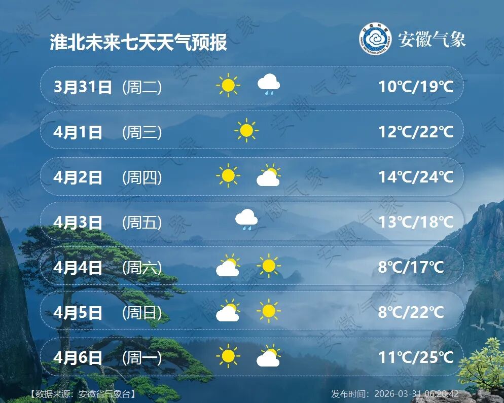 4月1日(周三):全省多云,江淮之间东部部分地区有小雨。