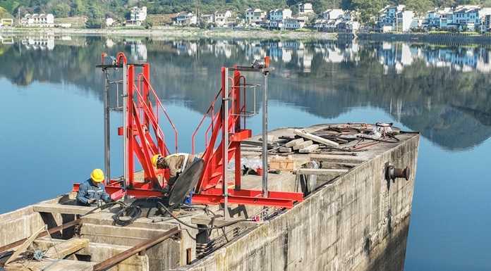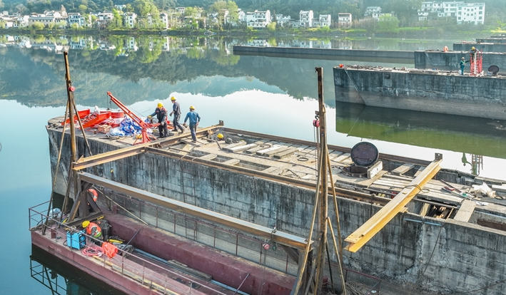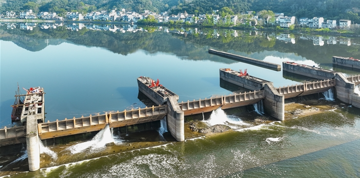 3月29日,歙县新安江妹滩大坝,工程技术人员在进行坝体安全排查,筑牢汛期安全屏障,守护沿岸百姓安澜。郑宏/摄