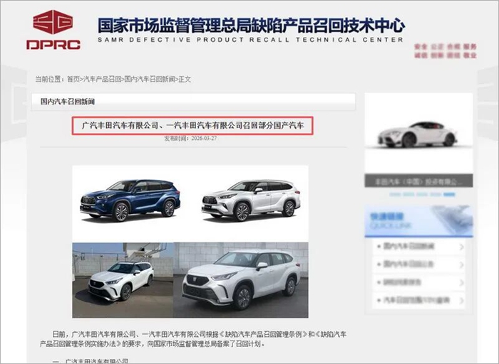 自2026年4月1日起,召回2021年8月7日至2025年9月22日生产的部分汉兰达汽车,共计317990辆;召回2021年7月27日至2026年1月20日生产的部分皇冠陆放汽车,共计242170辆。