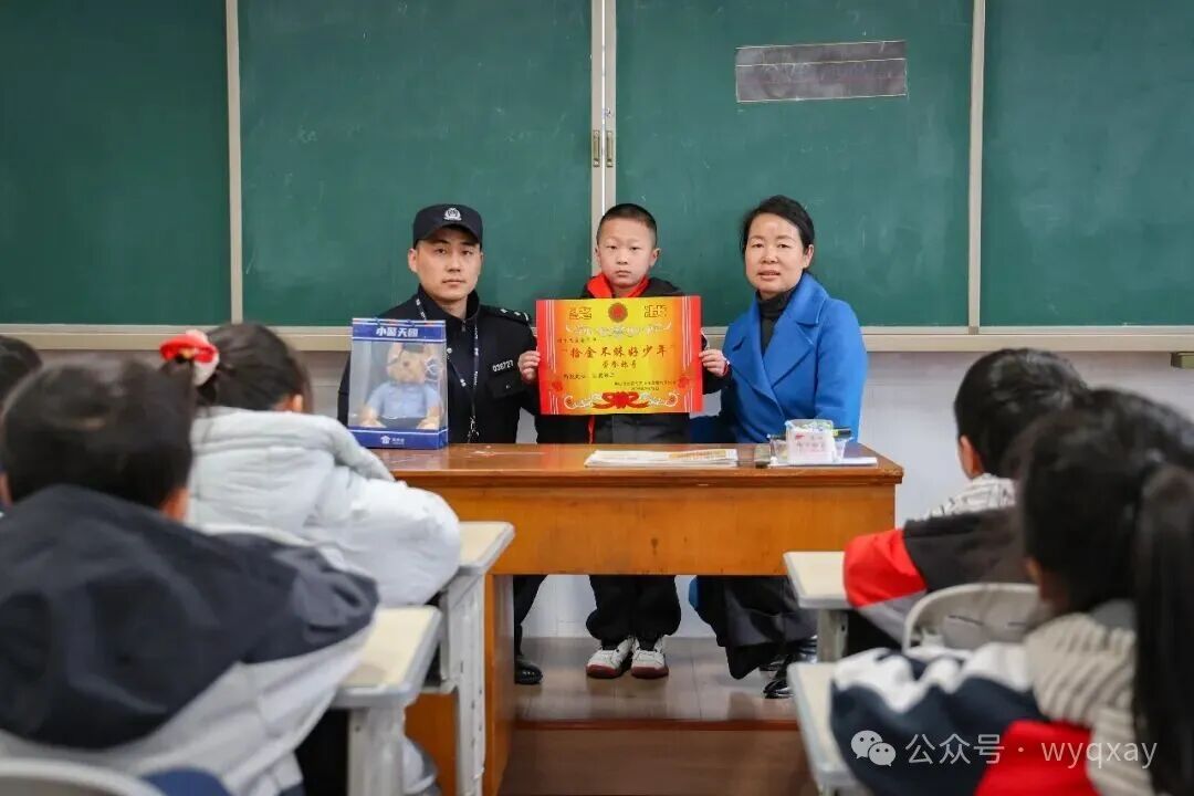 4月1日,黄山区居民朱女士在民警的引领下,找到了甘棠中心学校三年级学生周易豪,对他拾金不昧的行为表示感谢。