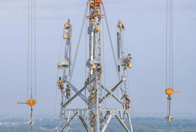 连日来,电力工人抢抓春季有利天气,奋战在繁昌区境内的甘肃—浙江±800千伏特高压直流输电工程施工建设一线,保障能源通道重点工程进度。甘肃—浙江±800千伏特高压直流输电工程是国家“十四五”电力发展规划重点项目,工程投运后,甘肃的风能、光伏等“绿电”将通过这条能源大动脉直送长三角。图为4月6日,电力工人在“甘电入浙”工程施工现场进行组塔作业。 特约摄影师 肖本祥 摄