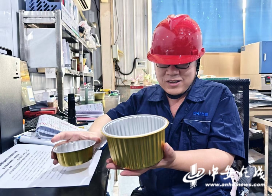 在车间检验室里,各式精美的铝制餐盒正在等待检测。工作人员告诉记者,食品容器铝箔相较于传统材料,具有耐高温、使用寿命长、可回收等优势。