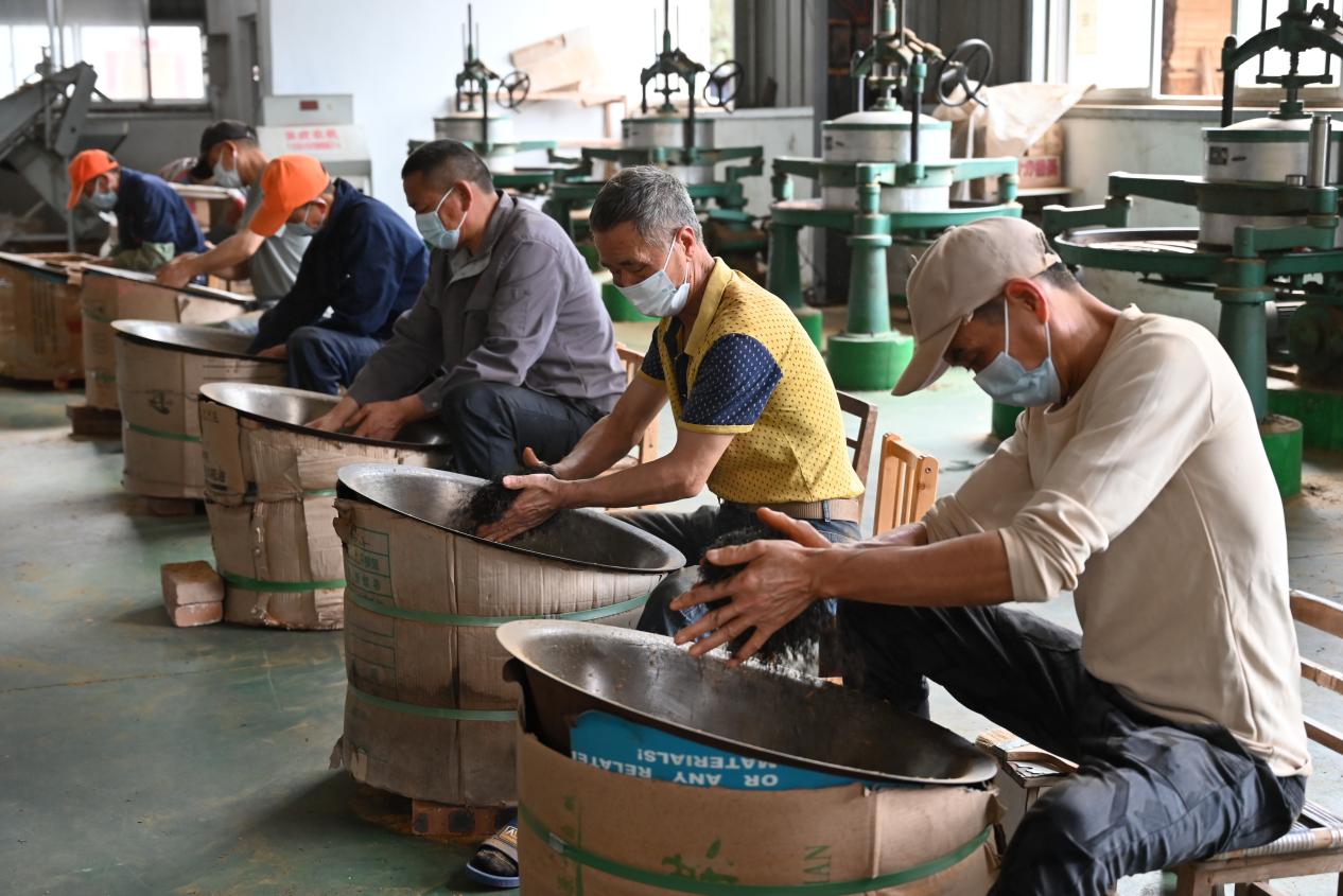 四月的祁门,空气中弥漫着茶叶的清香。清明过后,春茶开始进入了高峰期,当地红茶企业开足马力抓紧生产,茶乡处处呈现出一派热火朝天的繁忙景象。祁岁红茶厂建厂已十几年,每年茶季都会雇用村里村民帮忙收购和加工茶叶。在企业生产车间的一侧,制茶老师傅正在手工制作高端祁门红茶祁眉。他们围坐在铁锅旁,双手熟练地揉搓着茶叶,随着铁锅的温度升高,浓郁的茶香逐渐弥漫开来。这是制作祁眉的关键环节手工成形,只有经验丰富的师傅才能精准把握温度和力度,让茶叶形成酷似柳眉的细长外形。“我妈祁门红茶从3月28日开始生产,目前每天加工鲜叶3000多斤,高峰期预计要达到五千斤,祁门红茶一天产量在七八百斤。”祁门县祁岁红茶厂负责人黄春生介绍。