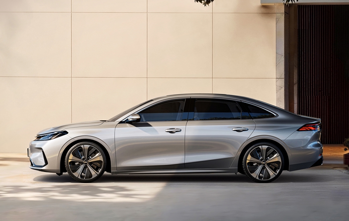 外观方面,新车细节有所升级。前脸采用封闭式格栅,凸显纯电身份;两侧雾灯区域换为纵向装饰,更具层次感;充电接口设于右前翼子板,使用更便捷。车身尺寸为4935/1905/1500mm,轴距2845mm,相比插混版(4918/1905/1495mm,轴距2845mm),车长和车高略有提升。轮胎提供215/60 R17和225/55 R18两种规格,车尾贯穿式尾灯细节优化,预计点亮效果更精致。