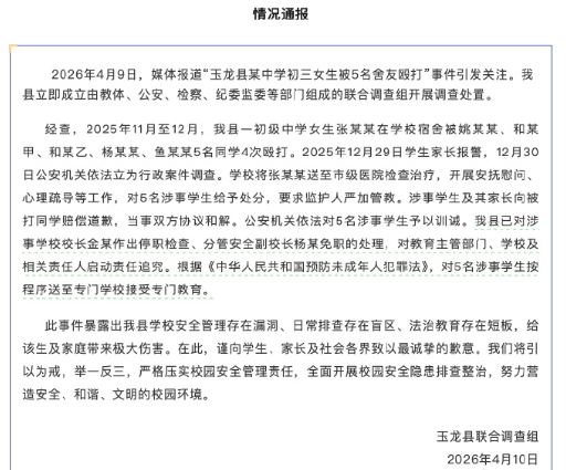 央视网消息:4月10日,云南玉龙县联合调查组发布情况通报:2026年4月9日,媒体报道“玉龙县某中学初三女生被5名舍友殴打”事件引发关注。我县立即成立由教体、公安、检察、纪委监委等部门组成的联合调查组开展调查处置。