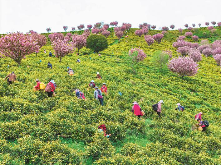 4月8日,在巢湖市庙岗街道浮槎山千亩茶园,茶农们抢抓农时,在漫山新绿与烂漫樱花间采摘春茶。浮槎山生态环境优越,茶产业已成为当地带动村民增收、助力乡村振兴的特色产业。通讯员 杨浩然 摄