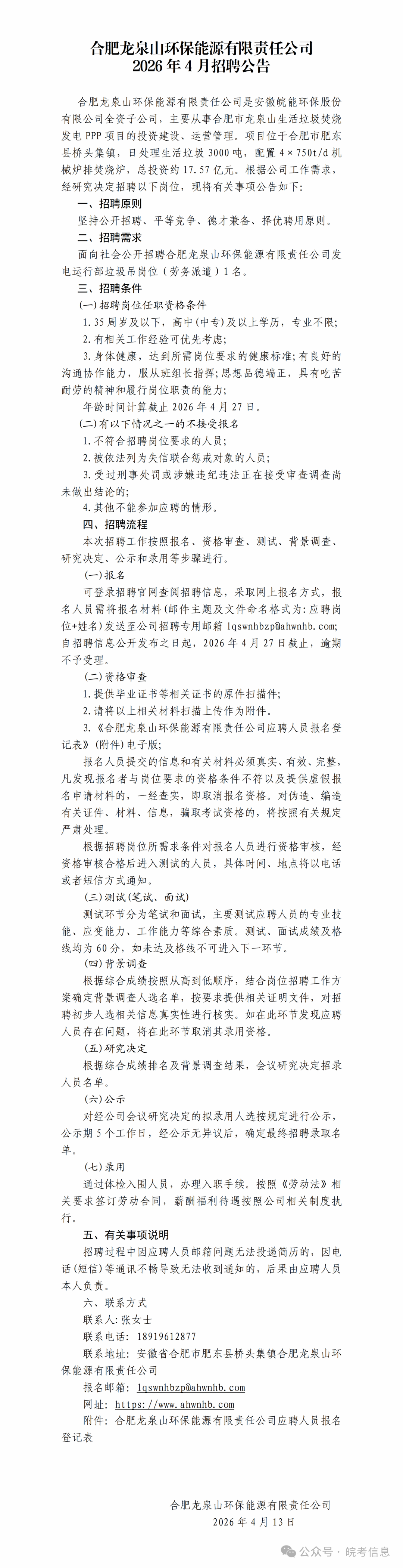 合肥龙泉山环保能源有限责任公司2026年4月社会招聘公告