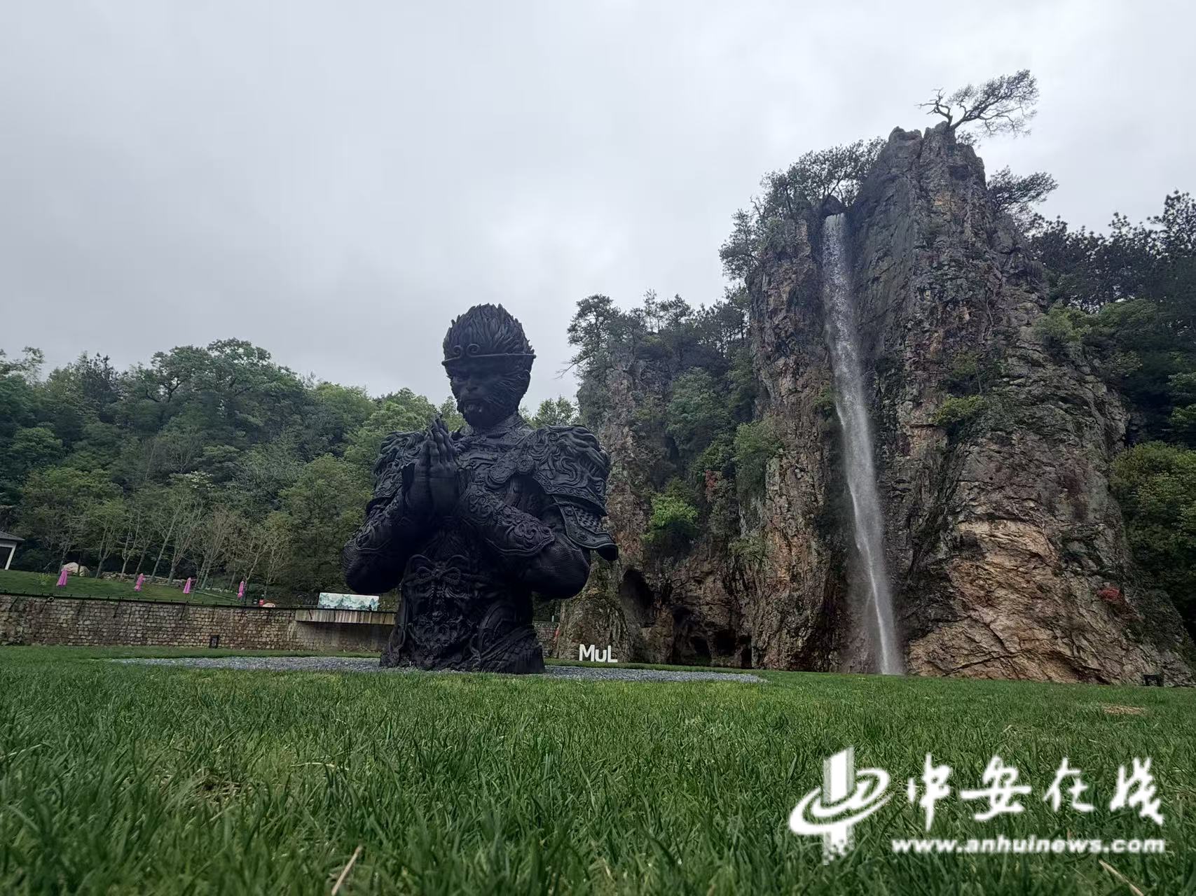 中安在线、中安新闻客户端讯 在大别山深处,一座风景秀丽的山岩前,悬垂一条飞流而下的瀑布,就在这条瀑布下,黑色石雕的齐天大圣孙悟空,双手合十,威风凛凛。在安徽省金寨县花石乡,这处名为“凤凰岩”,又称“小黄山”的自然景观,俨然成了花果山水帘洞,一座悟空雕塑,让这座石山玩起了cosplay。