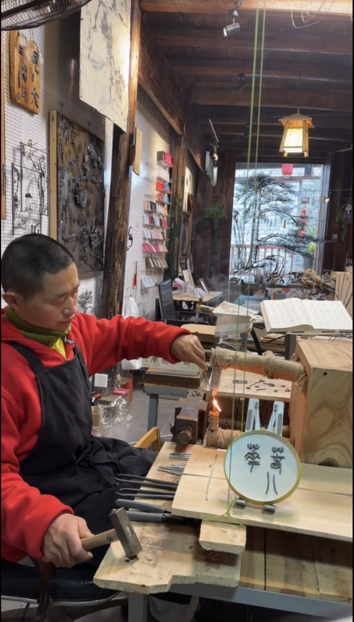 铁画工作室里,陈列着陶绍军的诸多佳作——山水铁画意境悠远,铁字书法苍劲有力,吉祥物灵动可爱,定制牌匾庄重雅致。玻璃窗上,经典代表作《迎客松》铁画傲然挺立,铁骨铮铮间尽显江南水墨的温婉意境,成为古镇最亮眼的文化符号。窗外,游客漫步于青石板路,偶然被屋内的火花飞溅与打铁锻造声吸引,驻足凝望、推门探访,传统技艺与市井烟火在此交融,古韵与生机共生。