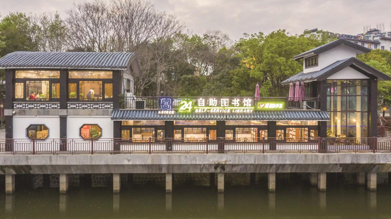 坐落于天长市滨河公园老东门河畔的茉莉书舫,为仿古船舫造型,被誉为 “水上书吧”“书香之舟”,是当地热门阅读打卡地。馆内实行全智能化运营,运用AR、VR等技术打造数字化新业态,强化夜读体验,提供24小时阅读、自习、借还等服务。馆内定期举办读书会、亲子阅读、文化讲座等活动,灯火辉映间,书香与夜景相融,成为群众的精神文化家园。