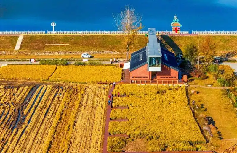 宿州稻田图书馆坐落于埇桥区夹沟镇镇头村,紧邻镇头水库、环抱千亩稻田,2025年5月开馆,是安徽“和美乡村”文旅融合新地标。馆舍约400-450㎡,内设农业科技、少儿绘本等主题书架,藏书约6000册。图书馆的设计暗含巧思。由中国建筑设计行业杰出人物郭三锁的团队操刀,建筑主体采用当地传统民居的红砖褐瓦,二层横跨具有现代感的蓝色玻璃长廊——传统与现代在此对话,建筑与稻田肌理自然呼应。