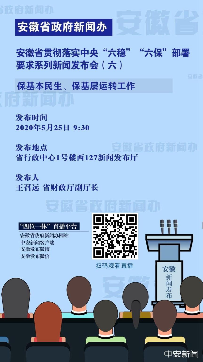 5月25日上午9:30,安徽省贯彻落实中央“六稳”“六保”部署要求系列新闻发布会(第六场)在省行政中心1号楼西127会议室举办,省财政厅副厅长王召远同志到会,介绍保基本民生、保基层运转工作有关情况,并回答记者提问。敬请关注!