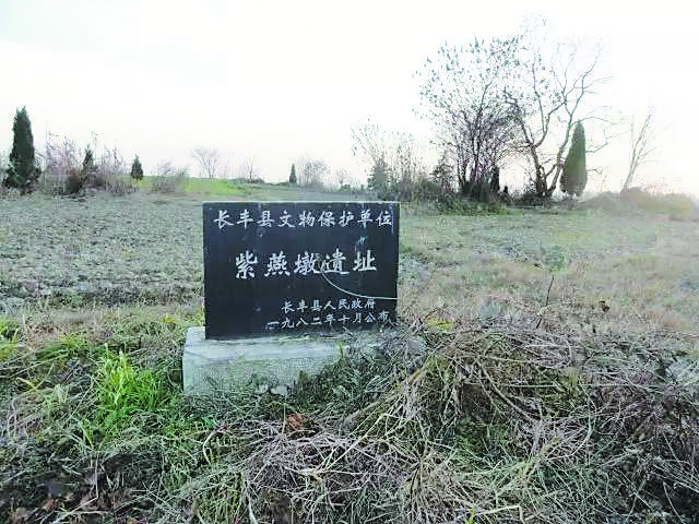 紫燕墩遗址所处地势较高,高出地表约5米,遗址上采集的标本非常丰富,不仅有红陶、灰陶、硬纹陶、鼎足、鬲足、鬲口沿、鬲腹片等,还曾出土过六个保存较为完好的战国青铜甬钟。该青铜甬钟铣间大而舞部小。上有甬,为圆柱形,甬下有旋,舞广粗短。在篆间36个枚,两面各18个。篆带及正鼓部装饰有云雷纹。青铜甬钟的出土,再一次佐证了战国时长丰区域曾生活着这样一群人,他们的生活既有战国时期贵族的特点,也逐渐呈现出地域性的特色,尤其是楚国的文化特质。该遗址属商至春秋古遗址,现为县重点文物保护单位。