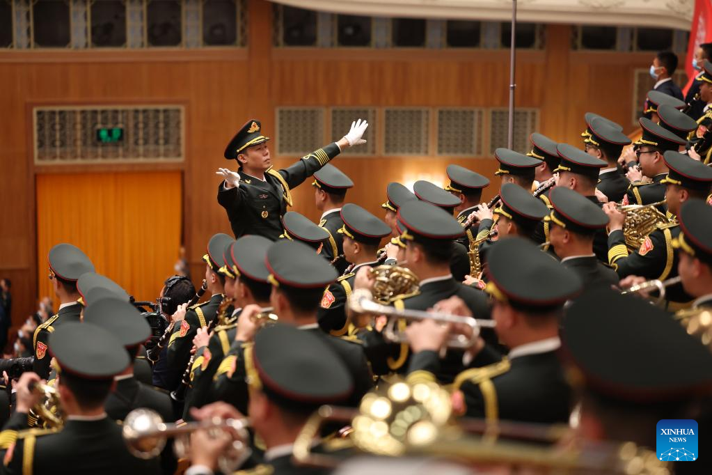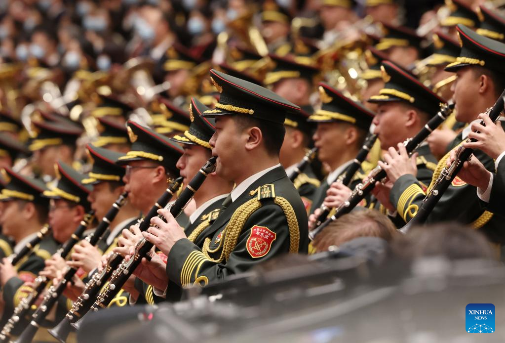 The military band of the Chinese People's Liberation Army performs at the opening session of the 20th National Congress of the Communist Party of China (CPC) in the Great Hall of the People in Beijing, capital of China, Oct. 16, 2022. (Xinhua/Li Ming)
