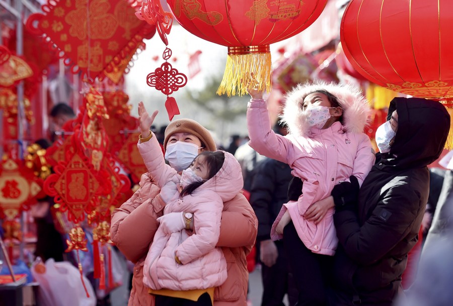 People select New Year decorations at a market in Zhengding County of Shijiazhuang, north China's Hebei Province, Jan. 18, 2023. (Photo by Zhang Xiaofeng/Xinhua)