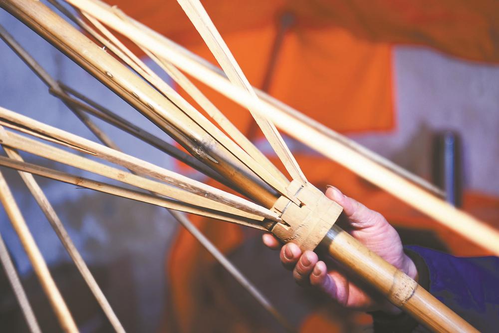 Gufeng oilcloth umbrellas have always been famous, and there is a reason for that. The Village is in a mountainous area 15 kilometers north of Jingxian County. The surrounding hills are rich in bamboo, a good material for making umbrella frames. Handmade umbrellas require 12 major and 88 minor steps, totaling about a week. First, the craftsmen must choose three to five-year-old bamboo for the umbrella frames. The more frames there are, the more delicate they need to be. The length, width, height and curvature of the frames, as well as the diameter and spacing of the spreaders, are all processed with great precision. Only then can the umbrella frames be seamlessly inserted into the spreader, and the umbrellas can be opened and closed freely.