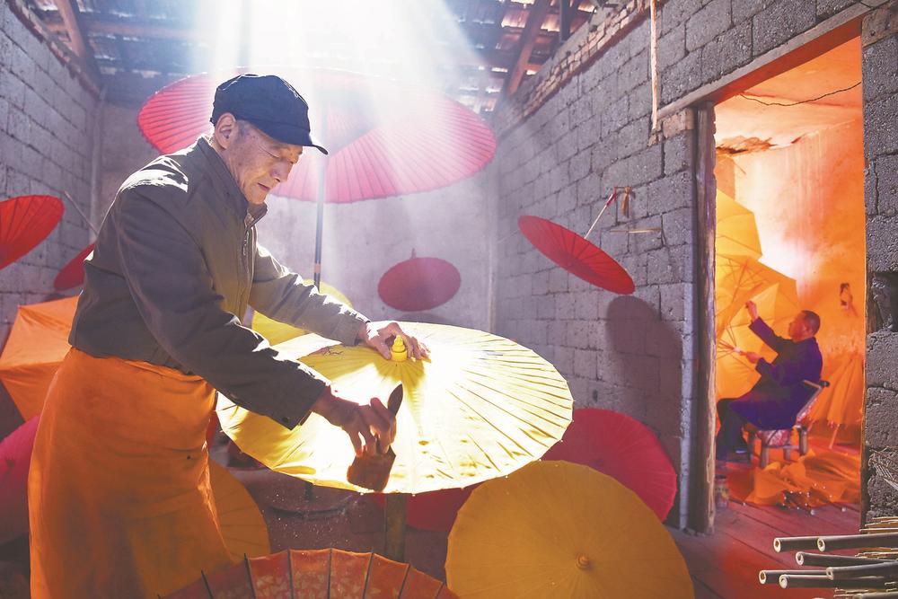 Nowadays, the oilcloth umbrellas made by Zheng Guomin have gradually lost their functionality and become props or gifts, with tens of thousands sold yearly. Although the oilcloth umbrella-making technique has been listed as a provincial intangible cultural heritage, Zheng Guomin has hidden concerns that few young people are willing to inherit this traditional craft. Gufeng oilcloth umbrellas are a bit lonely, and perhaps many years later, people can only see them in the photos taken by visitors.